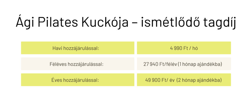 Ági Pilates Kuckójának egy a célja: hogy minél többen be tudjátok illeszteni napi rutinotokba a rendszeres Pilatest! Épp ezért, Kuckó-tagként, egy havi jelképes, ismétlődő díj, mindössze 4 990 Ft fejében teljes hozzáférést kapsz a Kuckó összes videójához. A belépésedkor fent levőkhöz csakúgy, mint a jövőben felkerülőkhöz. 🙂