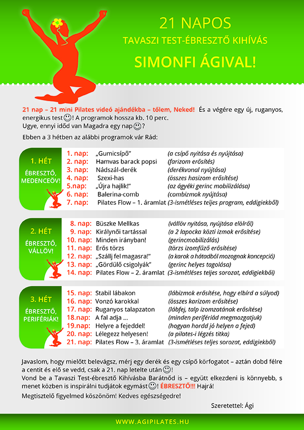 Gyere és kövesd a Kihívás eseményeit az Ágipilates FB oldalán is és ha tetszik, oszd meg Barátaiddal, Ismerőseiddel – hadd ébredjen fel a teste mindazoknak, akik hajlandók tenni is érte ;)! A Pilates a legjobb “eszköz” erre!